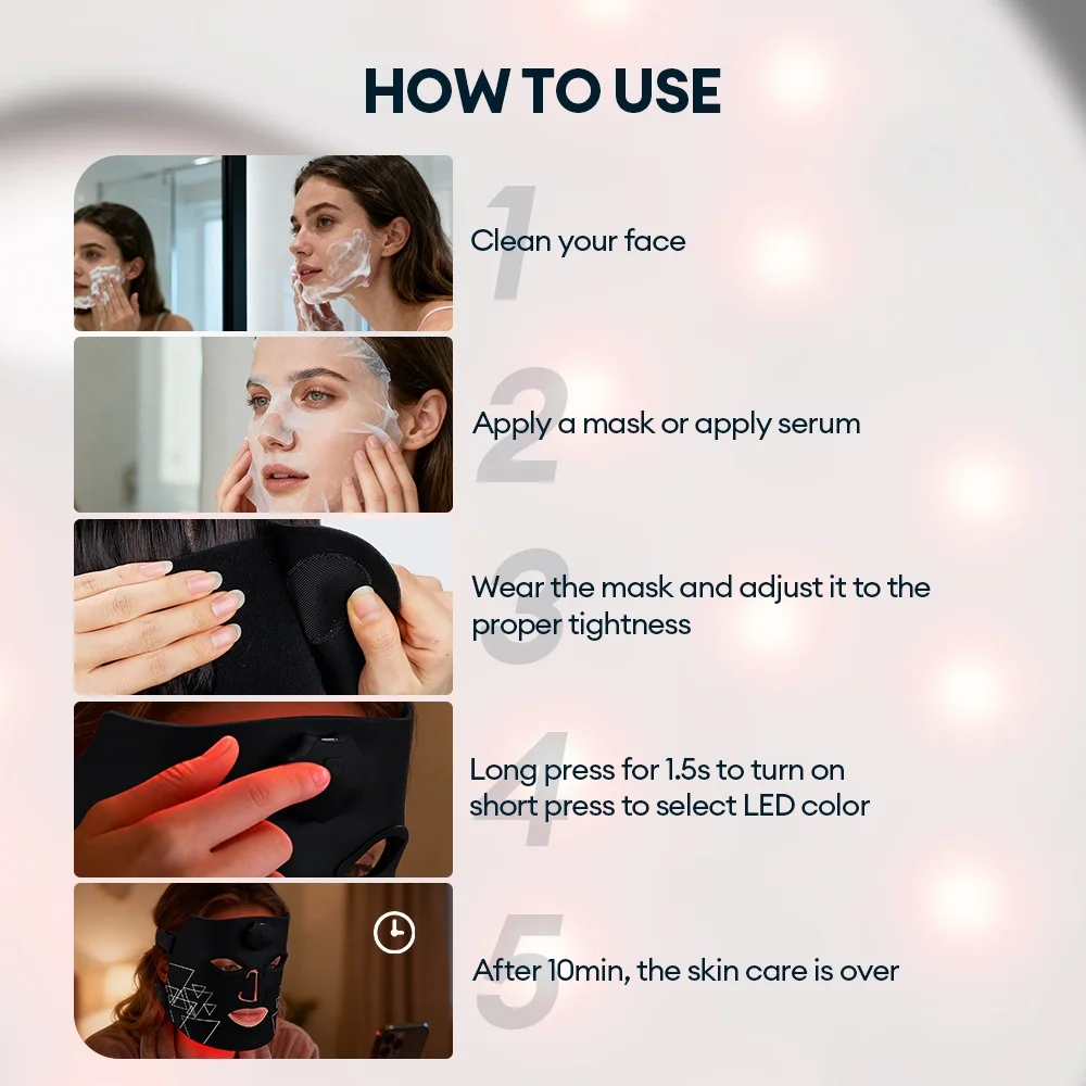 2.Multi-effect care. 60 LED beneficial light beads, 180 wicks, 32mw/cm² irradiance, dense and even light irradiation, fully covering the face, efficient skin care.